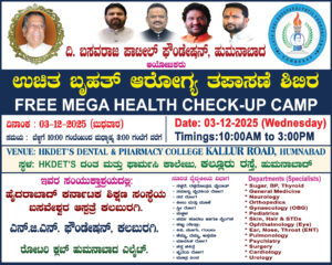 ಹುಮನಾಬಾದನ ದಿವಂಗತ.ಬಸವರಾಜ ಪಾಟೀಲ ಫೌಂಡೇಶನ್, ಕಲಬುರ್ಗಿಯ ಹೈದ್ರಾಬಾದ್ ಕರ್ನಾಟಕ ಶಿಕ್ಷಣ ಸಂಸ್ಥೆಯ ಬಸವೇಶ್ವರ ಆಸ್ಪತ್ರೆ, ಎನ್.ಜಿ. ಎನ್ ಫೌಂಡೇಶನ್ ಕಲಬುರ್ಗಿ ಹಾಗೂ ರೋಟರಿ ಕ್ಲಬ್ ಹುಮನಾಬಾದ್ ಎಲೈಟ್ ವತಿಯಿಂದ ಇದೇ ಡಿಸೆಂಬರ್ 3ರಂದು ಭವ್ಯ ಆರೋಗ್ಯ ತಪಾಸಣಾ ಶಿಬಿರವನ್ನು ಆಯೋಜಿಸಲಾಗಿದೆ.